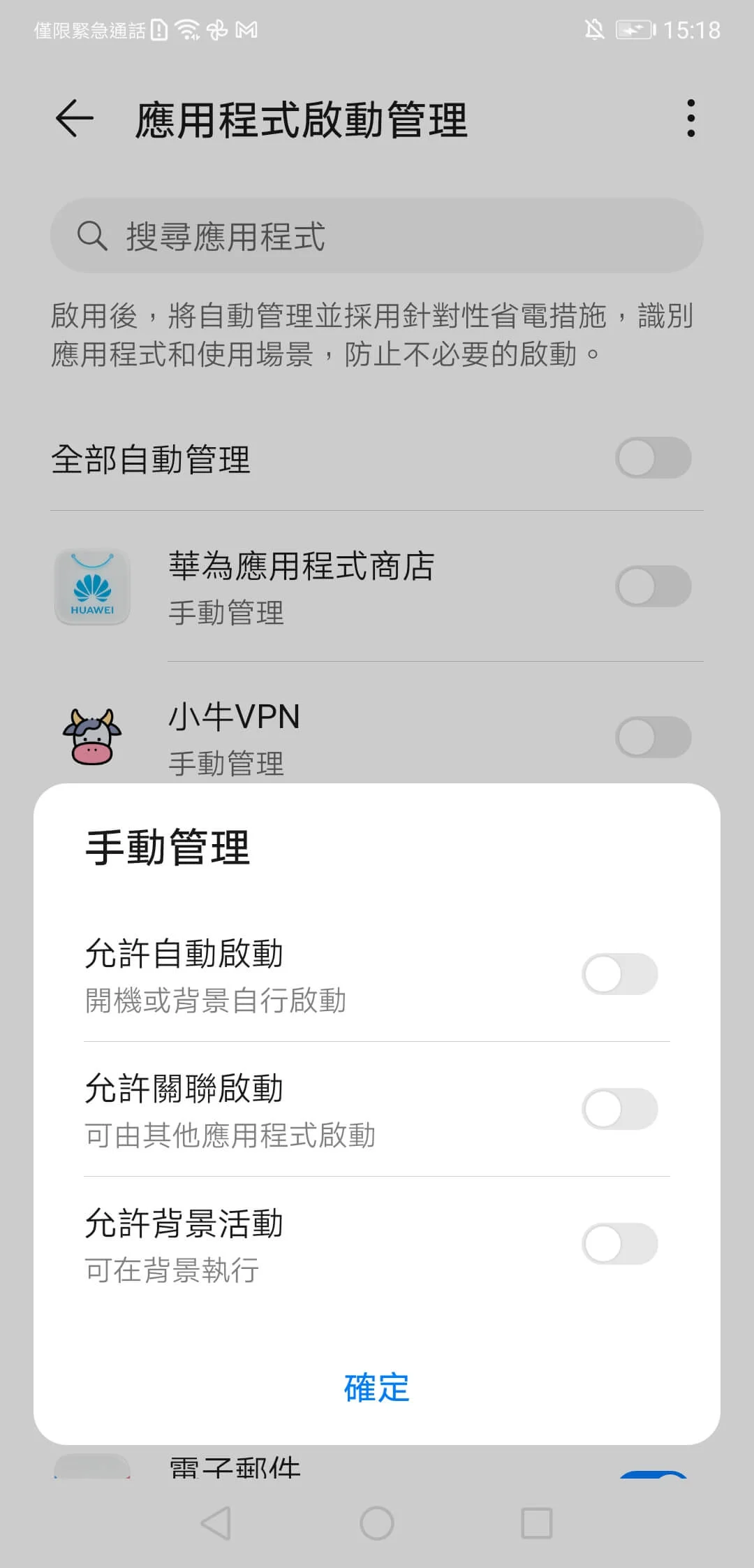 去到 設定 -> 應用程式 -> 應用程式啟動管理,找到小牛 VPN,變成手動管理,關閉 “允許自動啟動”,“允許關聯啟動” 和 “允許背景活動”,如圖所示,最後重新打開小牛 VPN。或者 去到設定 ->應用程式和服務 -> 應用程式啟動管理,找到小牛 VPN,變成手動管理,關閉 “允許自動啟動”,“允許關聯啟動” 和 “允許背景活動”,如圖所示,最後重新打開小牛 VPN。